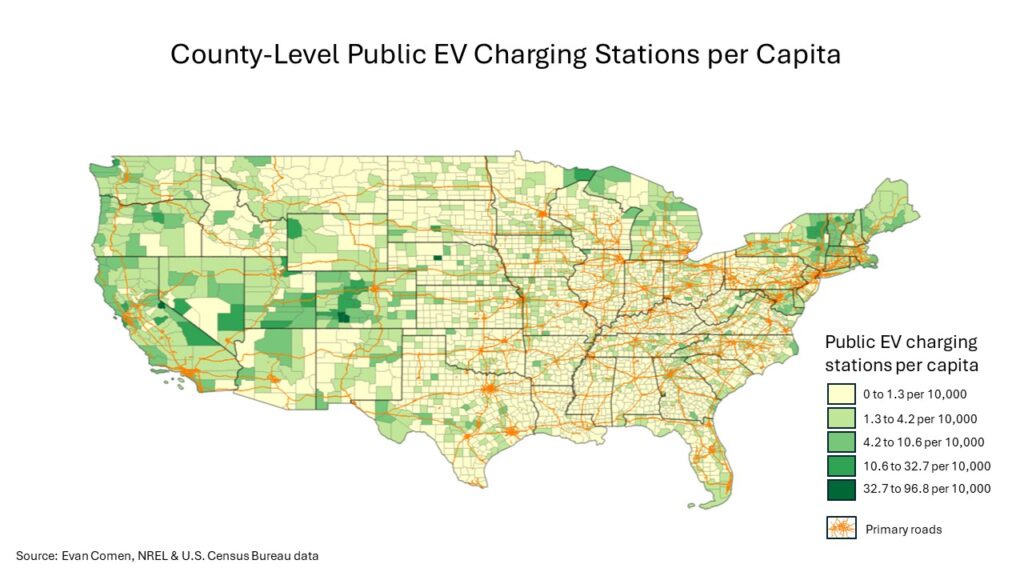 While the highest concentrations of EV chargers are in wealthy, educated tech hubs with high EV demand, the buildout of a national charging infrastructure poses a classic chicken-and-egg marketplace problem and may require government intervention. Consumers are reluctant to buy EVs without proper charging infrastructure, while firms are unwilling to invest in EV infrastructure without a robust customer base. With insufficient incentives for firms, state and local governments and private businesses may need federal funds to help complete the national network.
