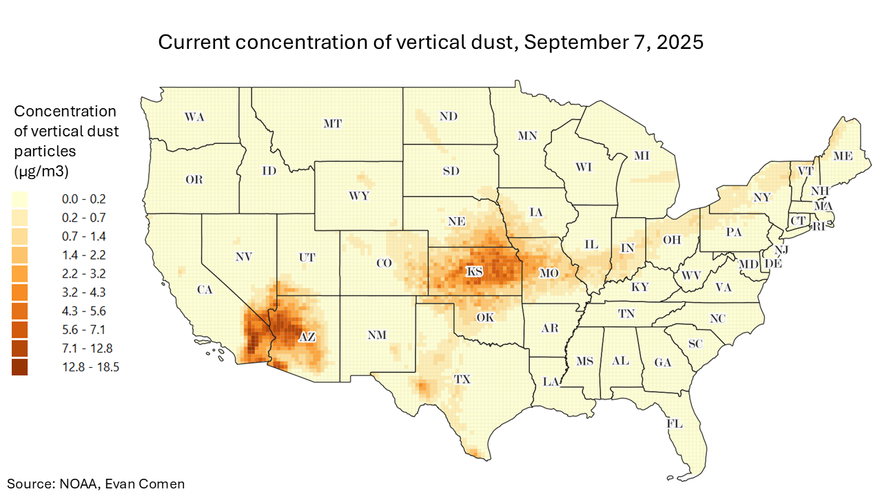 https://climate-crisis-247-bucket.nyc3.cdn.digitaloceanspaces.com/wp-content/uploads/2025/09/07203656/Current-concentration-of-vertical-dust-September-7-2025-150x150.pngIn recent weeks, dangerous dust storms have pummeled the Southwest. Heavy winds in Nevada caused a massive dust storm to blow through Burning Man, grinding the festival to a halt, and earlier haboobs in Phoenix caused an airport shutdown.