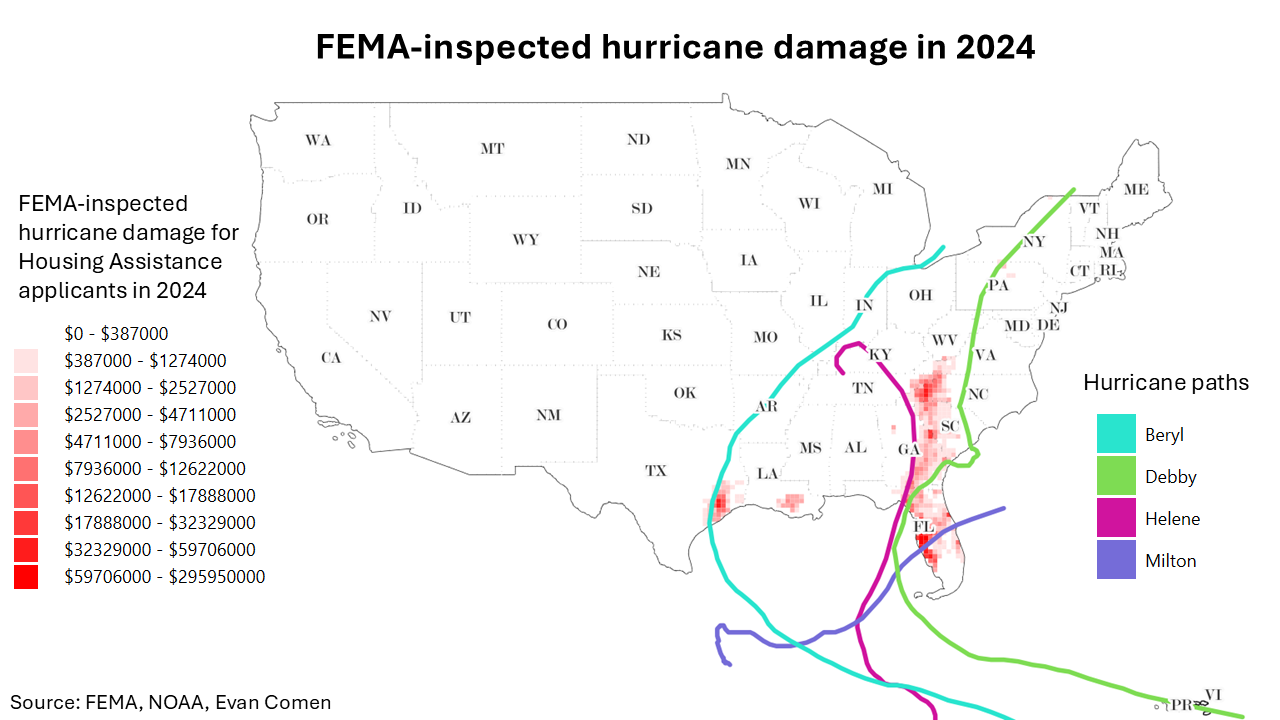 - Hurricane damage recorded by FEMA in 2024: $17,270,641