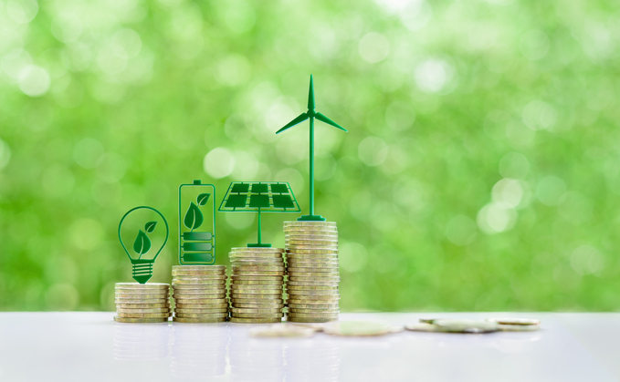 Renewable or clean energy generation prices and costs, financial concept : Green eco-friendly symbols atop coin stacks e.g. energy efficient light bulb, a battery, a solar cell panel, a wind turbine.
