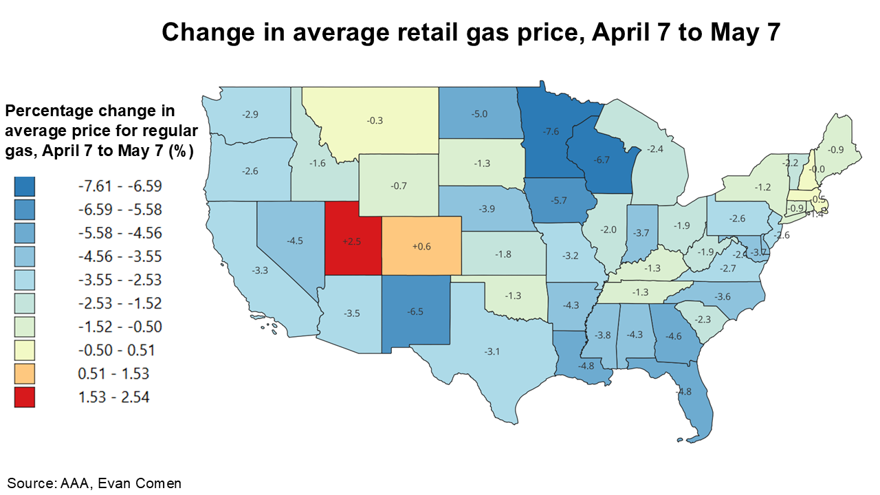 - Average gas price, May 7: $2.751 per gallon (-4.3% from April 7)