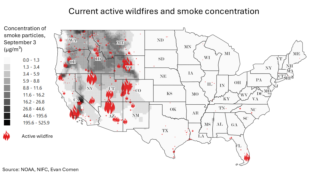 https://climate-crisis-247-bucket.nyc3.cdn.digitaloceanspaces.com/wp-content/uploads/2025/09/07204040/Current-active-wildfires-and-smoke-concentration-150x150.pngIn what has rapidly become one of the busiest wildfire seasons in recent memory, fires continued to spread across the western United States and Alaska last week. The Dragon Bravo Fire in Grand Canyon National Park remains the largest active wildfire in the country, while several other megafires are blazing in the West.