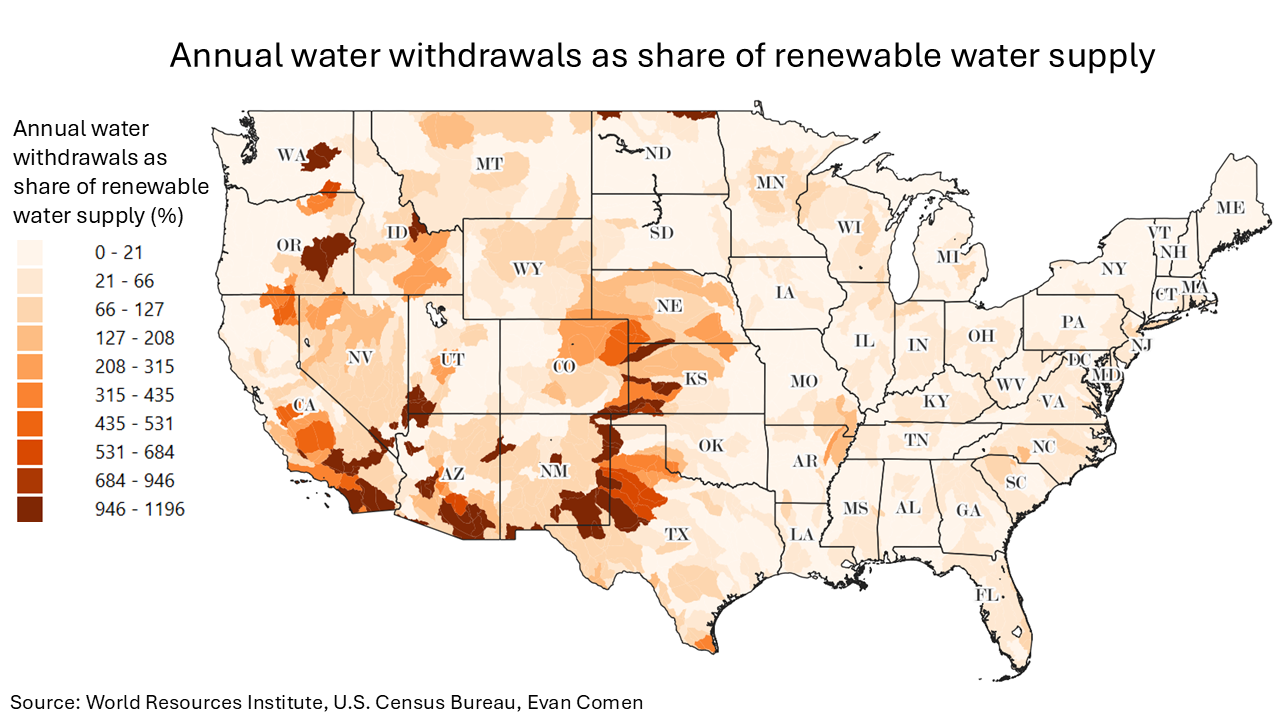 https://climate-crisis-247-bucket.nyc3.cdn.digitaloceanspaces.com/wp-content/uploads/2025/08/07210021/Annual-water-withdrawals-as-share-of-renewable-water-supply-150x150.pngNationwide, a majority of the U.S. population lives in sustainable water basins. Water supply outweighs demand in most counties, and on a national level the U.S. ranks 71st out of 181 countries in baseline water stress.