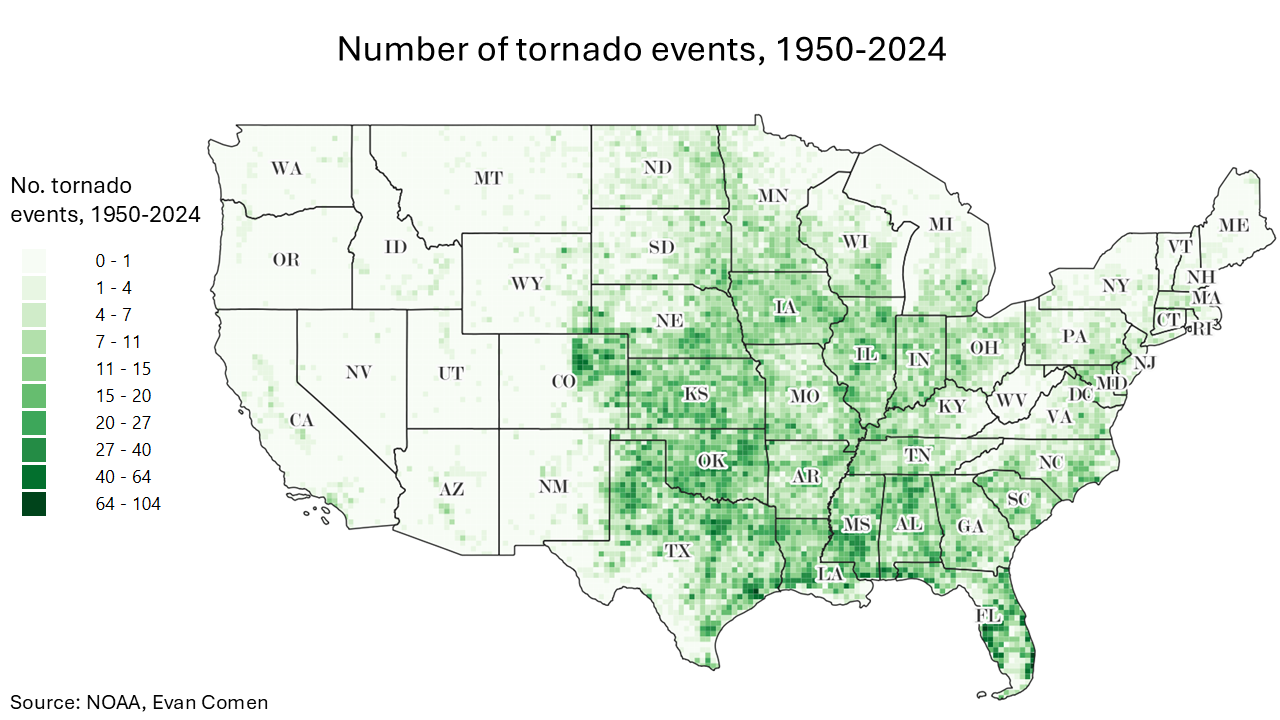- No. tornado events, 1950-2024: 128 storms