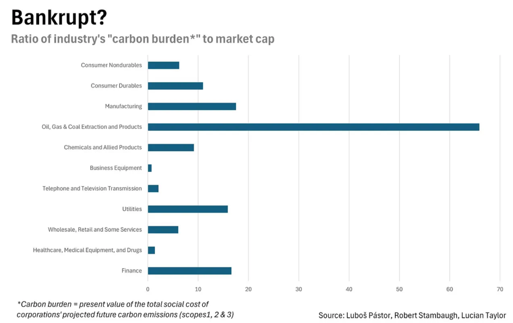 That’s the implication of just-completed research into the present value of the social cost of corporations’ future carbon emissions. Titled “Carbon Burden,” the study was conducted by Luboš Pástor of the University of Chicago’s Booth School of Business and Robert Stambaugh and Lucian Taylor of the Wharton School at the University of Pennsylvania. They estimated that corporate America’s total carbon burden is $87 trillion, which is 1.3 times its total market capitalization as of the end of 2023.