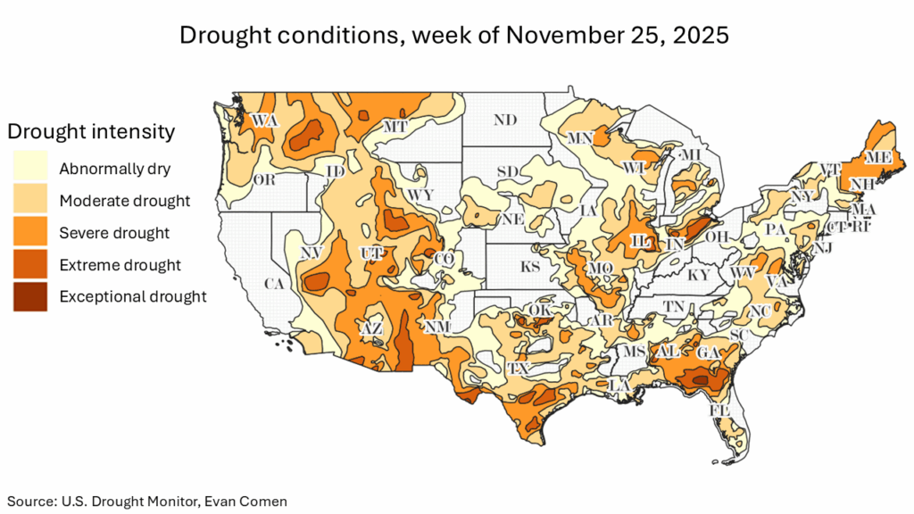 New data from the U.S. Drought Monitor shows a sharp escalation in dry conditions heading into late November. Nearly 20% of the contiguous United States is in severe drought or worse, a level the country hasn’t seen since midsummer. In several parts of the Southwest, Great Plains, and interior West, conditions have tipped into exceptional drought – the most extreme category of drought, marked by widespread crop losses, water shortages, and heightened wildfire danger.